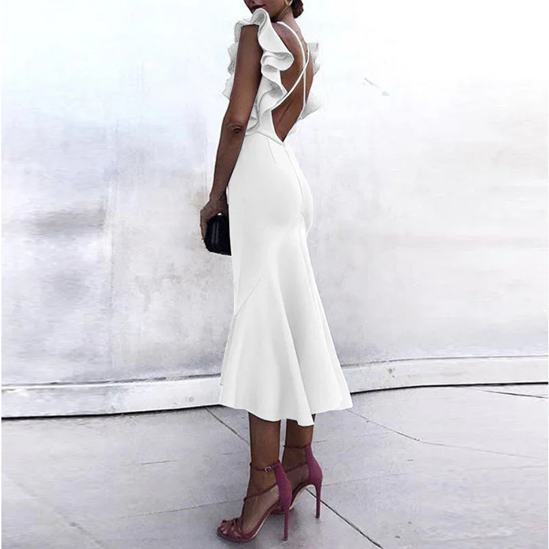 Un abito raffinato e senza tempo, a tinta unita e con scollatura a V che valorizza il décolleté con eleganza. Realizzato in poliestere di alta qualità (81%-90%), è leggero, confortevole e perfetto per occasioni speciali, eventi serali o cerimonie.